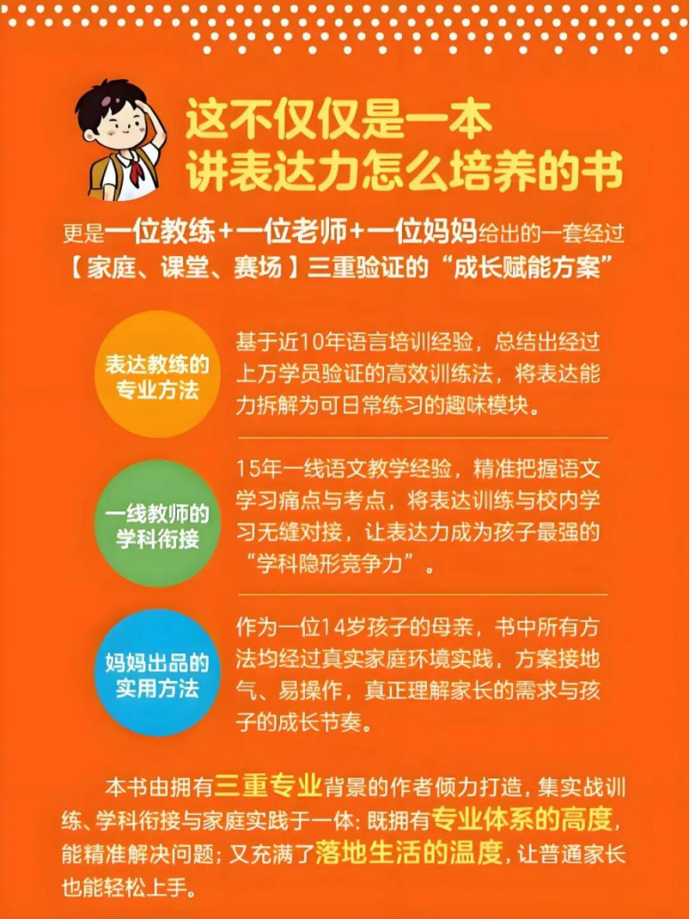 在家庭教育投资日益理性的当下,家长们越发关注能为孩子带来终身复利的“底层能力”培养。10月23日,由拥有8年表达教练、15年一线语文教学经验,同时身为14岁孩子母亲的王雪晶(笔名长安)所著的《儿童表达力训练手册》,将在当当网正式首发。该书打破表达教育学用壁垒,衔接校内知识与校外实践,为6-12岁儿童搭建从敢说到善思的成长阶梯,是一份经过家庭、课堂、赛场三重验证的“儿童成长赋能方案”。